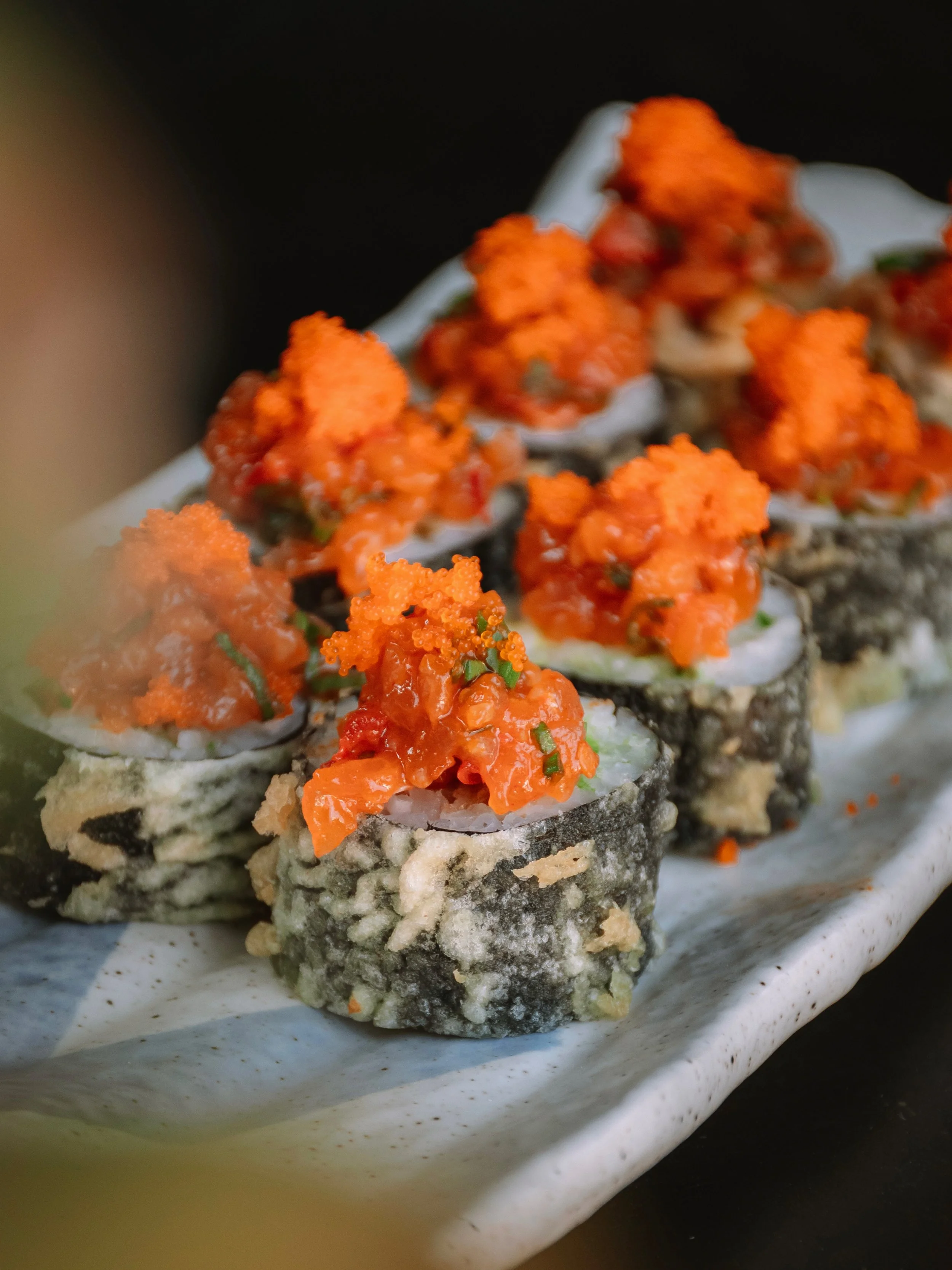 Stuffed whit crab, avocado and cucumber, battered in tempura, with salmon and yuzu topping.
