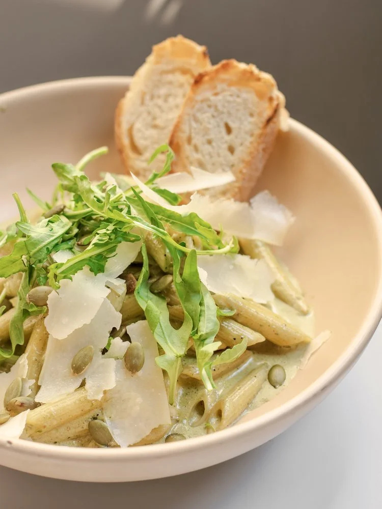 Penne pasta, chicken, creamy pesto sauce, arugula, pumpkin seeds, parmesan cheese. 350g