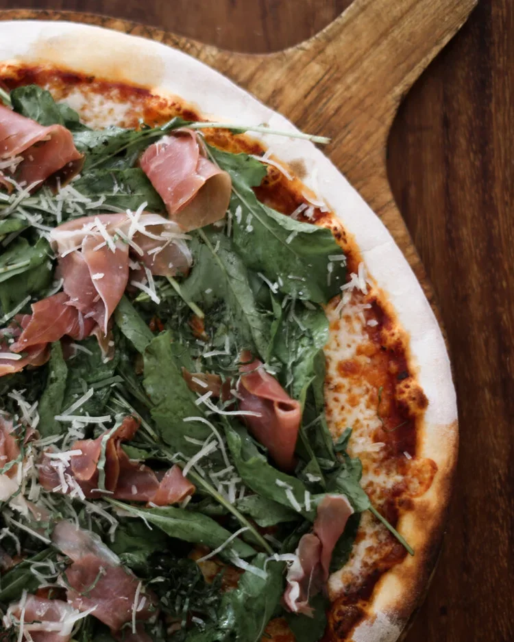 Pomodoro sauce, mozzarella cheese, arugula, prosciutto, basil, balsamic vinaigrette & parmesan cheese.