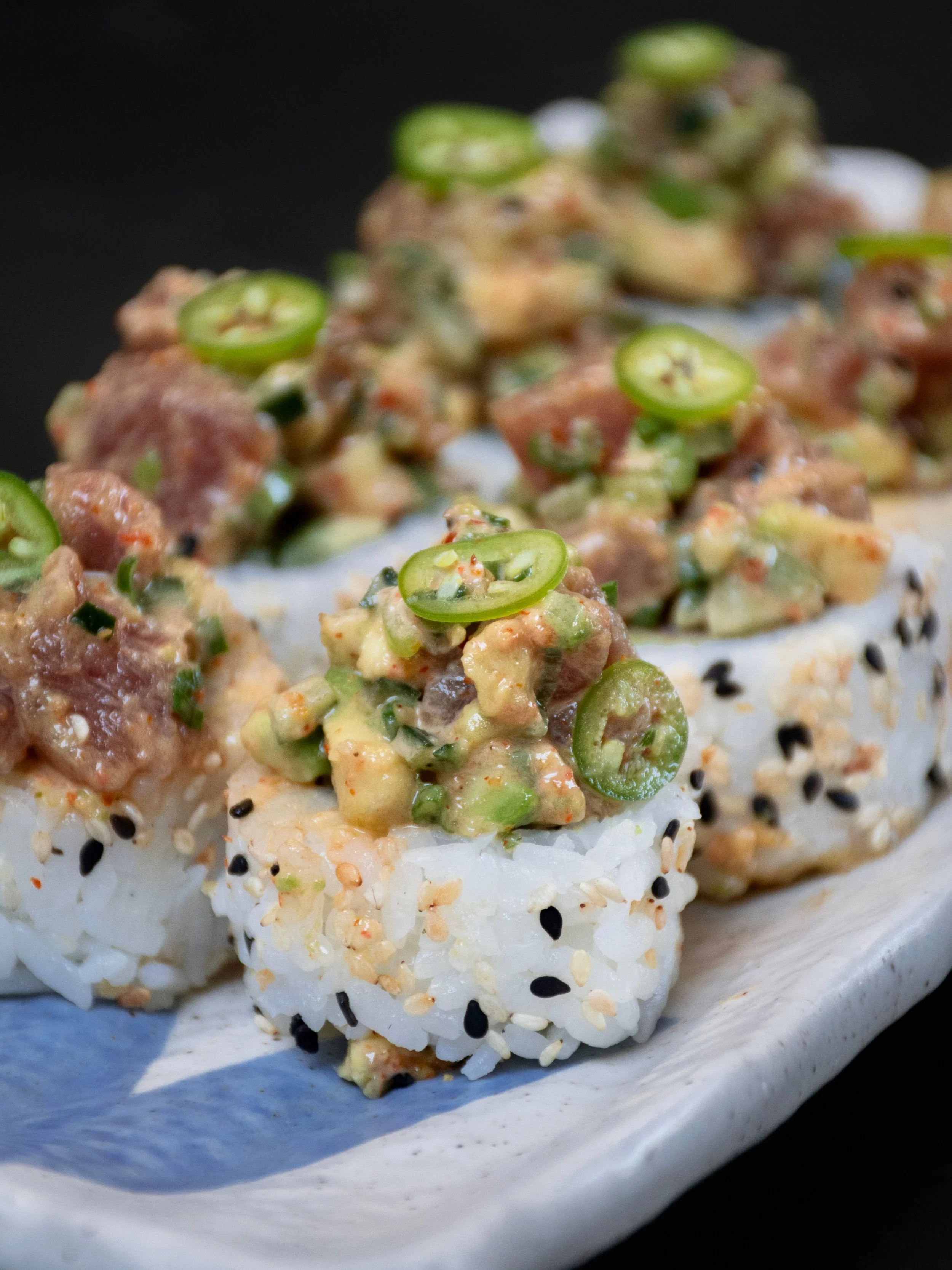 On the outside: tuna seasoned with sriracha, chives and nikiri sauce