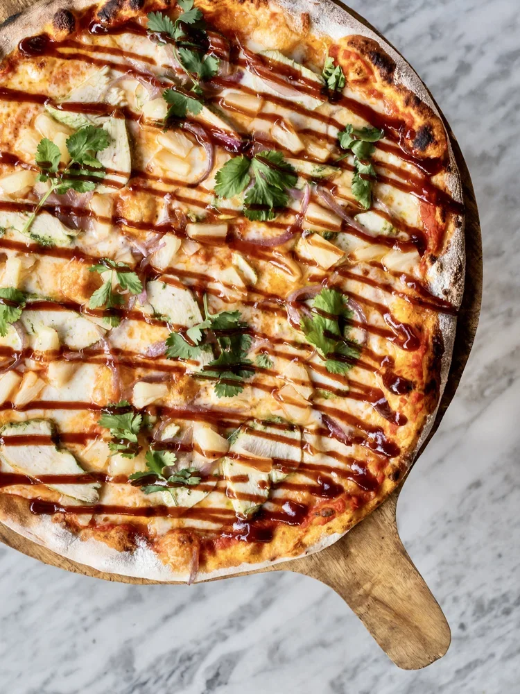 Pomodoro sauce, mozzarella cheese, chicken, pineapple, baked onion, crowned with tamarind BBQ sauce & cilantro.
