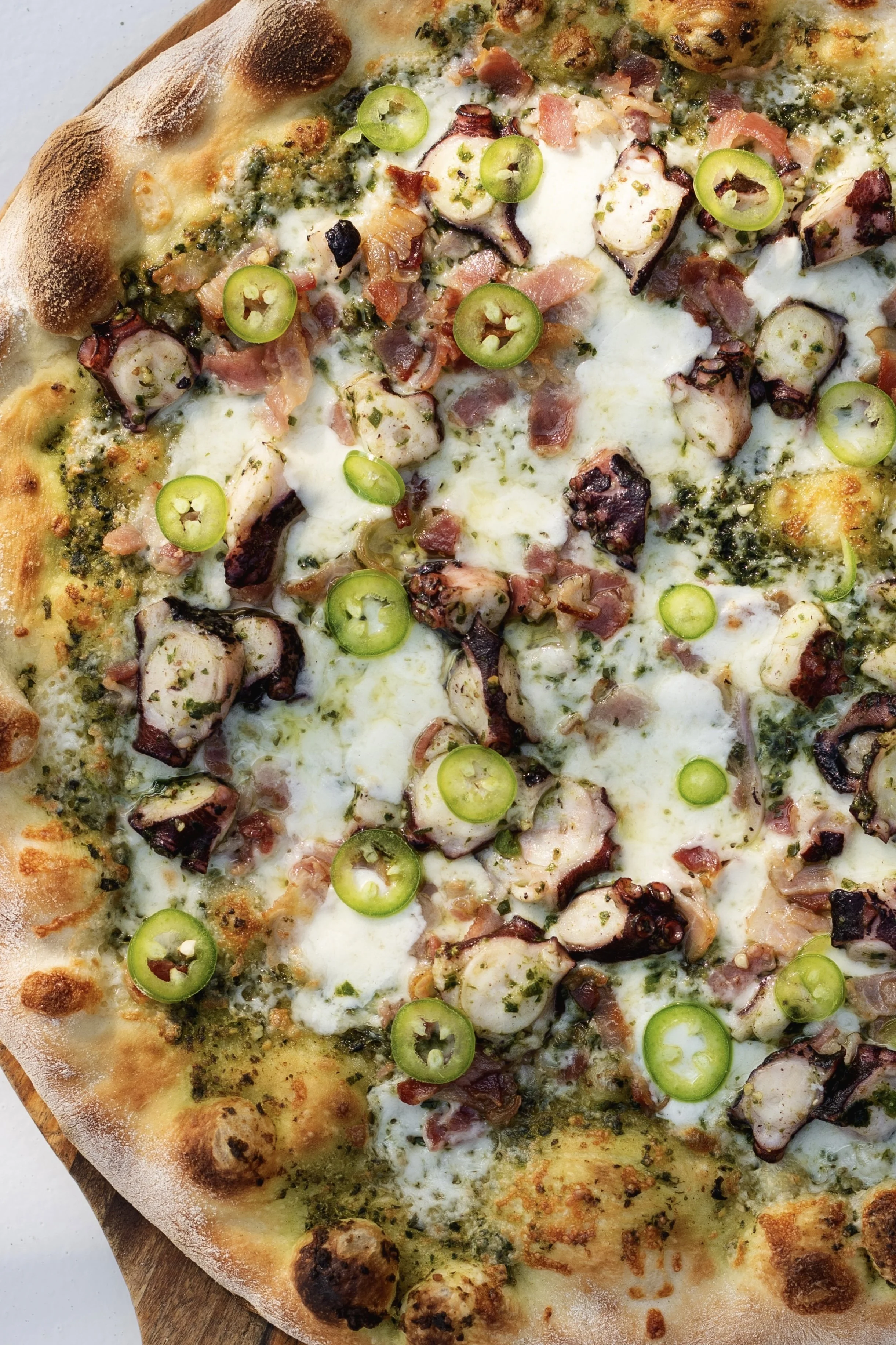 Octopus, bacon, pesto sauce, serrano chilli.
