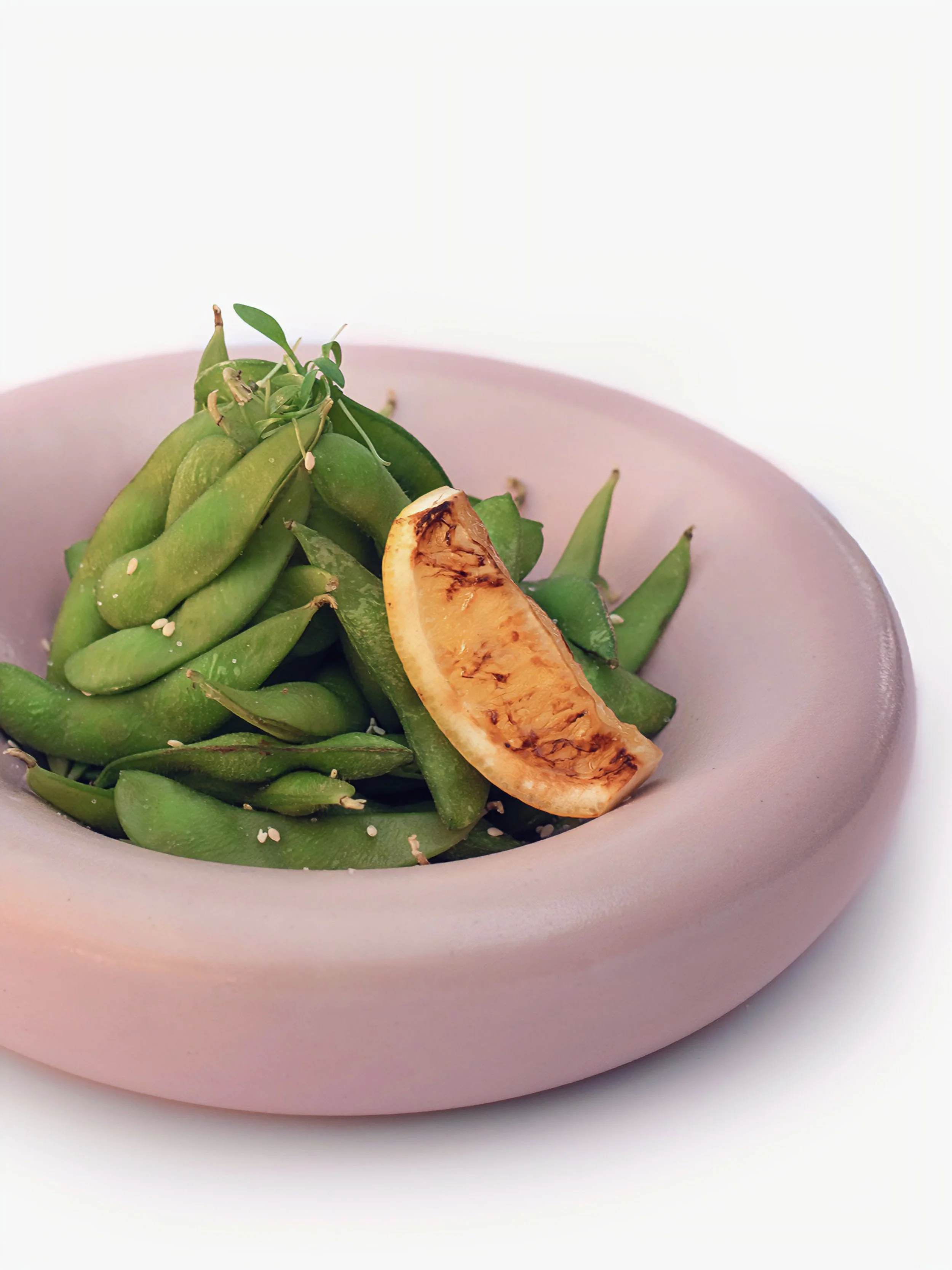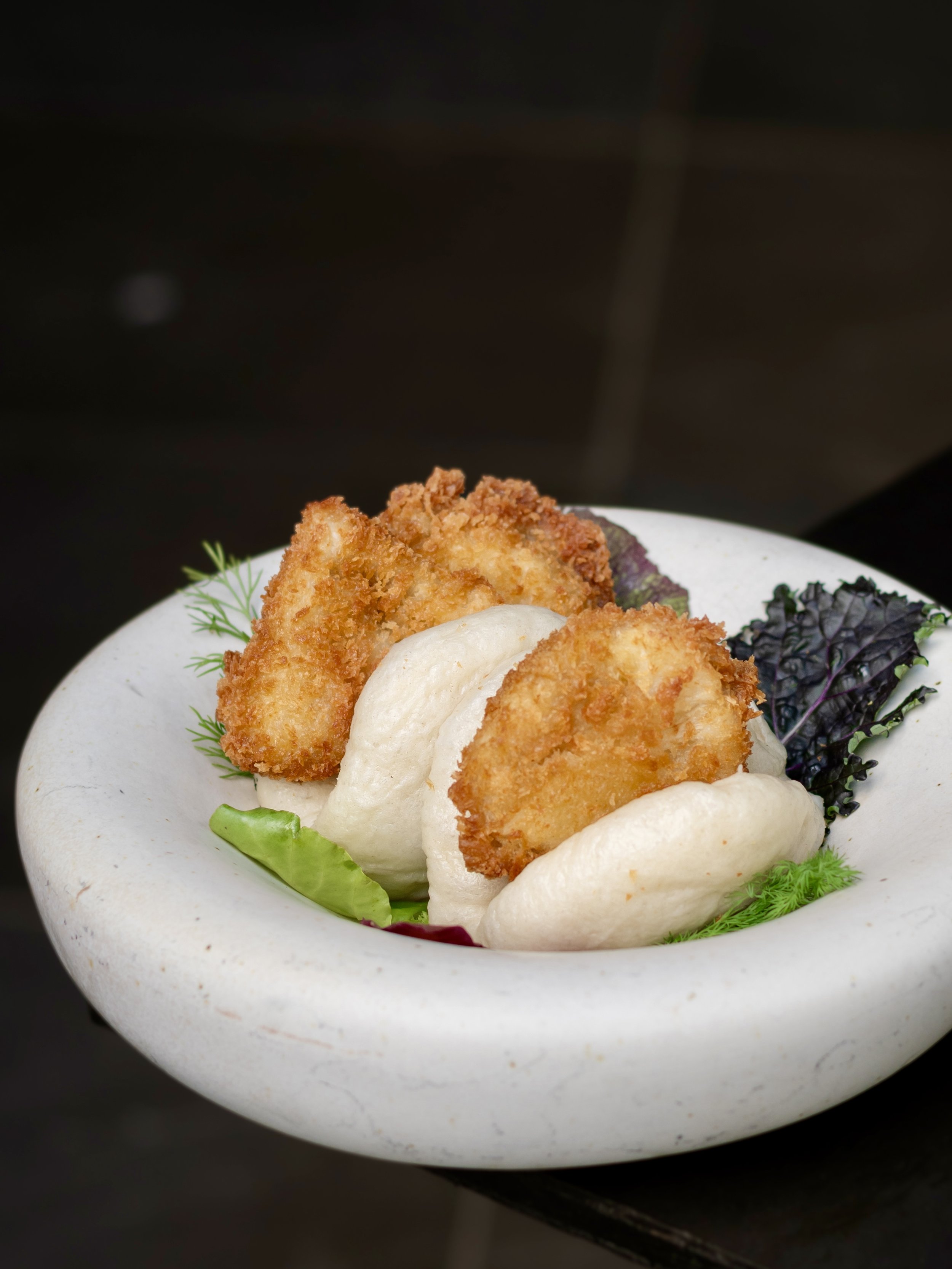 Pan bao al vapor, relleno de jaiba de concha suave frita, cebolla encurtida acompañada de salsa poblana