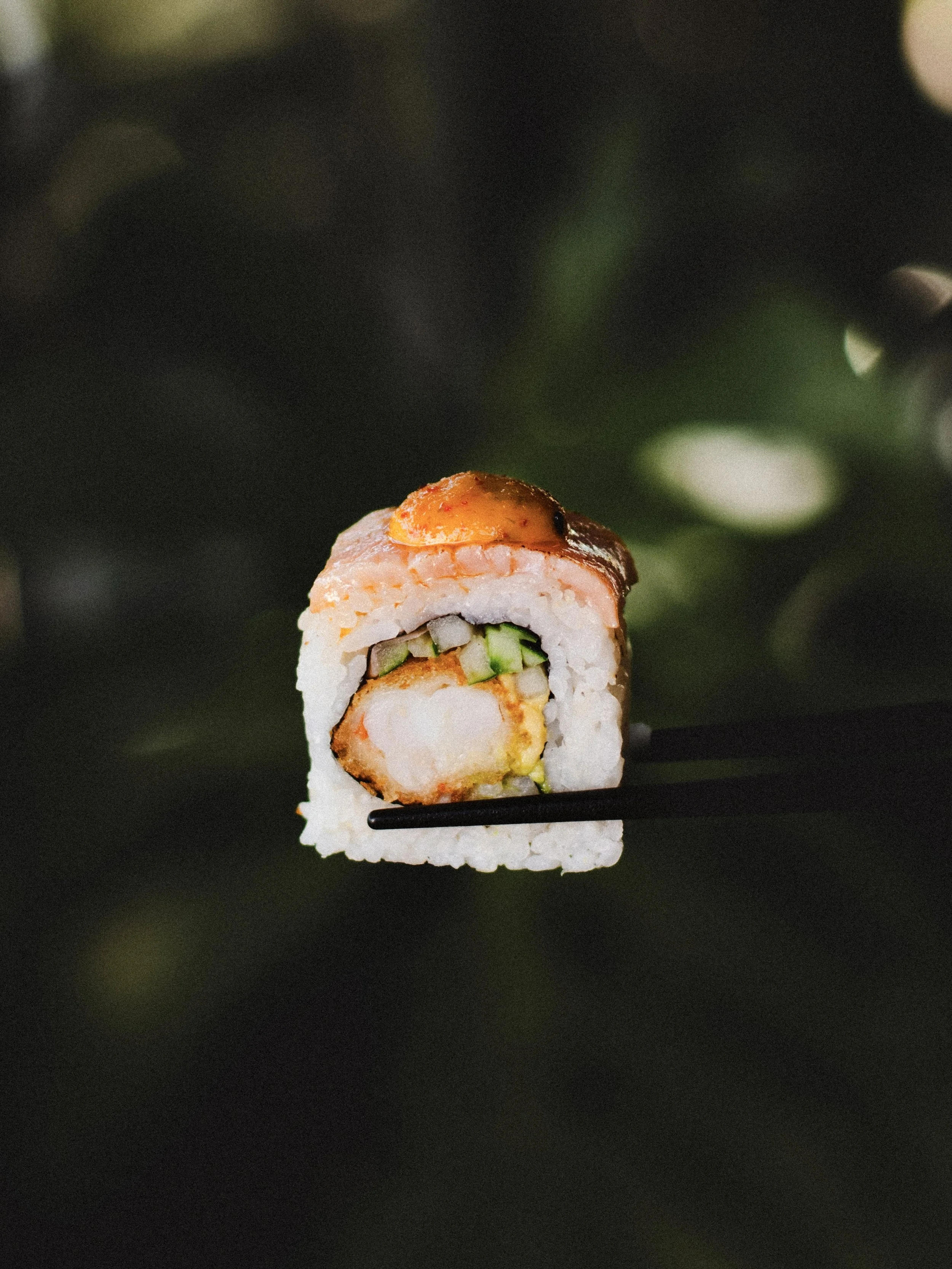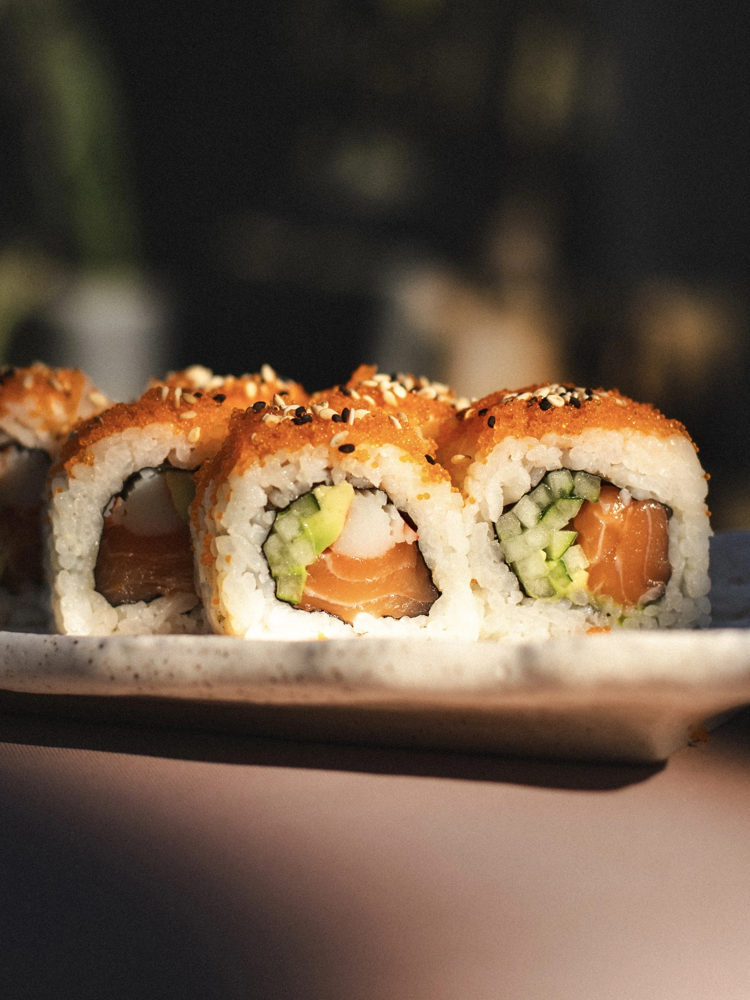 Relleno de cangrejo, aguacate, y pepino. Capeado en tempura, con toping de salmón y yuzu.